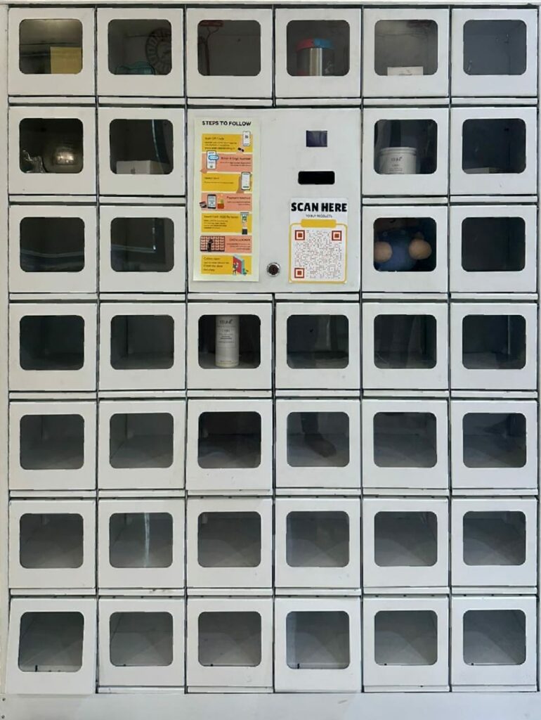 This concept is particularly useful in places like gyms, swimming pools, or recreational centers, where customers may not want to carry their purchases with them during activities but still want access to products like towels, swimsuits, or sports gear. It offers both convenience and security for customers.